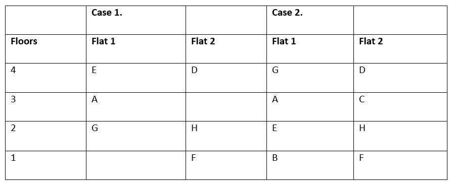 E lives on an even numbered floor but not in an even numbered flat. D lives two floors above F. Neither A nor H lives on the same floor. B doesn’t live on the same floor of G. A lives northwest of F who lives immediately below H. C lives one of the floors above E. Only one person lives between E and G both are living on the same numbered flat.