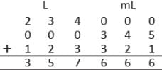 Add the following volumes of liquid: 234 L, 345 mL and 123 L 321 mL