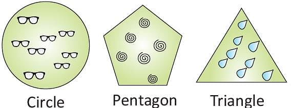 Three shapes circle, pentagon, and triangle are given with some patterns inside. Which two shapes have the same number of patterns inside?