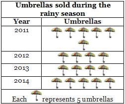 Direction: The pictograph shows the number of umbrellas sold by a shop during the rainy season in the last four years.