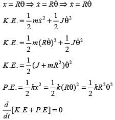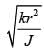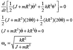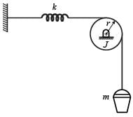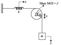 Consider the system shown in figure A rope goes over a pulley. A mass, m is hanging from rope. A spring of stiffness, k is attached at one end of rope. Assume rope is inextensible, massless and there is no slip between pulley and rope. The pulley radius is r and its mass moment of inertia is J. Assume that the mass is vibrating harmonically about its static equilibrium position. The natural frequency of the system is
