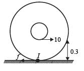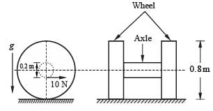 The wheels and axle system lying on a rough surface is shown in the figure. Each wheel has diameter 0.8 m and mass 1 kg. Assume that the mass of the wheel is concentrated at rim and neglect the mass of spokes. The diameter of axle is 0.2 m and its mass is 1.5 kg. Neglect the moment of Inertia of axle and assume g = 9.81 m/s2 . An effort of 10 N is applied on the axle in the horizontal direction shown at mid span of the axle. Assume that the wheels move on a horizontal surface without slip. The acceleration of the wheel the axle system in horizontal direction is _______ m/s2 (round off to one decimal place).