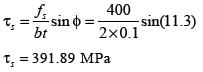In a pure orthogonal turning by a zero rake angle single point carbide cutting tool the shear force has been computed to be 400 N. If the cutting velocity 100 m/min Vc = , depth of cut t = 2.0 mm , feed S0 = 0.1 mm/revolution and chip flow velocity Vf = 20 m/min , then the shear strength τs of the material will be _______ MPa.(round off to two decimal places).