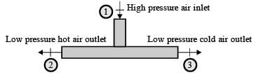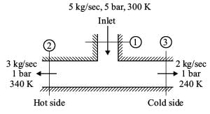 An adiabatic vortex tube, shown in the figure given below is supplied with 5 kg/s of air (inlet 1) at 500 kPa and 300 K. Two separate streams of air are leaving the device from outlets 2 and 3. Hot air leaves the device at a rate of 3 kg/s from outlet 2 at 100 kPa and 340 K, while 2 kg/s of cold air stream is leaving the device from outlet 3 at 100 kPa and 240 K.
