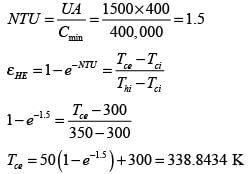 A shell and tube heat exchange is used as a steam condenser. Coolant water inters the tube at 300 K and at a rate of 100 kg/s. The overall heat transfer coefficient is 1500 W/m2K and total heat transfer area is 400 m2 . Steam condenses at a saturation temperature of 350 K. Assume that the specific heat of coolant water is 4000 J/kgK. The temperature of the coolant water coming out of the condenser is _______ K (round off to the nearest integer)