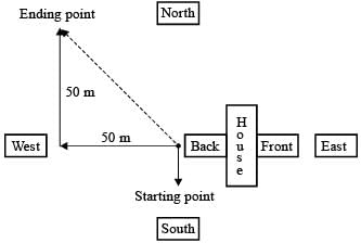 The front door of Mr. X’s house faces East. Mr. X leaves the house walking 50 m straight from the back door that is situated directly opposite to the front door. He then turns to his right walks for another 50 m and stops. The direction of the point Mr. X is now located at with respect to the starting point is ___________