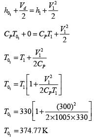 Consider adiabatic flow of air through a duct. At a given point in the duct, velocity of air is 300 m/s, temperature is 330K and pressure is 180 kPa. Assume that the air behaves as a perfect gas with constant Cp = 1.005 kJ/kgK . The stagnation temperature at this point is ________ K (round off to two decimal places).