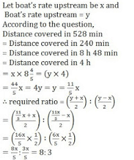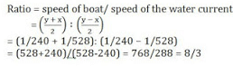 एक धारा के प्रतिकूल चल रही नाव एक निश्चित दूरी को तय करने में 528 मिनट लेती है जबी वह उतनी ही दूरी धारा के अनुकूल चलने में 240 मिनट लेती है| नाव की गति और जल प्रवाह की गति के बीच क्रमशः अनुपात क्या है?