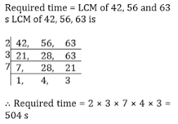 मोनिका, वेरोनिका और रचत एक वृत्ताकार स्टेडियम के आसपास दौड़ना शुरू करते हैं| वे अपना चक्कर क्रमशः 42 सेकंड , 56 सेकंड और 63 सेकंड में पूरा करते हैं| कितने सेकंड में वे सभी आरंभिक बिंदु पर मिलेंगे?