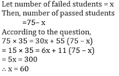 यदि एक कक्षा में, 75 छात्र हैं और वार्षिक परीक्षा में उनके अंकों का औसत 35 है| यदि उत्तीर्ण छात्रों के अंकों का औसत 55 है और असफल छात्रों के अंकों का औसत 30 है तो असफल हुए छात्रों की संख्या ज्ञात कीजिए?