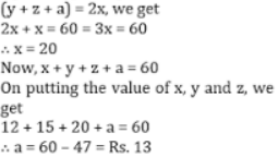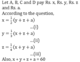 A, B, C और D एक 60 रुपए का तोहफा खरीदते हैं| Aअन्य से ½ का भुगतान करता है, B अन्य से 1/3 का भुगतान करता है और C अन्य से 1/4 का भुगतान करता है| D द्वारा कितना भुगतान किया गया?