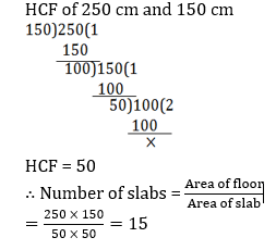 एक कमरे के 2 मी 50 सेमी लम्बे और 1 मीटर 50 सेमी चौड़े फर्श पर बने सबसे बड़ी वर्ग स्लैब की भुजा को ज्ञात कीजिए| फर्श पर बने ऐसे कितने स्लैब बन सकते हैं|