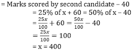 एक उम्मीदवार 25% प्राप्त करता है और 60 अंकों से असफल हो जाता है जबकि एक अन्य उम्मीदवार 50% अंक प्राप्त करता है जो परीक्षा उत्तीर्ण करने के लिए आवश्यक न्यूनतम अंक से 40 अंक अधिक है|परीक्षा में अधिकतम अंक ज्ञात करें?