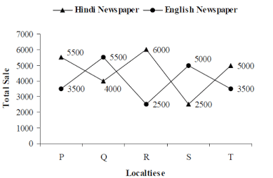 शहर के पांच अलग अलग इलाकों P,Q,R,S,T में हिंदी और अंग्रजी समाचार पत्र की कुल विक्रय :