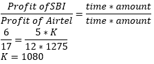 SBI और Airtel पांच माह पूर्व एक भागीदारी में प्रवेश करतें हैं। SBI और Airtel के लाभ प्राप्ति का अनुपात 6 : 17 है। अगर Airtel, 12 माह पूर्व अपना व्यापार 1275 रुपयों के साथ शुरू करता है तो SBI द्वारा दी गयी योगदान राशि क्या होगी ?