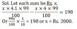 दो सामान राशियों को क्रमशः एक को 4% तथा दूसरी को 4.1% की वार्षिक दर से साधारण ब्याज पर 99 वर्षो के लिए निवेश किया जाता है, बाद वाले निवेश से प्राप्त किया गया साधारण ब्याज पहले वाले निवेश से प्राप्त साधारण ब्याज से 198 रुपये अधिक है तो प्रत्येक राशी ज्ञात कीजिये: