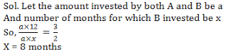 A और B एक व्यापार में समान पूंजी निवेश करते हैं. वर्ष के अंत में वे लाभ को 3:2 के अनुपात में बांटते हैं. यदि A ने अपनी पूंजी पूरे वर्ष के लिये निवेश की थी तो B ने कितने महीनों के लिये अपनी पूंजी निवेश की थी ?