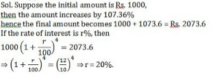 एक राशी को 4 वर्षो के लिए निश्चित दर पर चक्रवृद्धि ब्याज पर निवेश किया जाता है. 4 वर्षो के बाद उस राशी में 107.36%. की वृद्धि होती है, तो उसकी ब्याज की दर ज्ञात कीजिये?