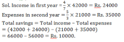 लगातार दो वर्षों के लिए, मेरी आय 4:7 के अनुपात में है और व्यय 3:5 के अनुपात में है. यदि दूसरे वर्ष में मेरी आय 42000 रु है और पहले वर्ष में मेरा व्यय 21000 रु है, तो दो वर्ष के लिये मेरी कुल बचत है -