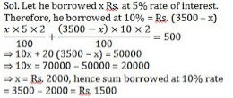 एक दुध वाला दो व्यक्तियों से 3,500 रुपये का ऋण लेता है. पहले व्यक्ति को वह 5% की वार्षिक दर से तथा दुसरे व्यक्ति को 10% की वार्षिक दर से ब्याज देता है| वह दो वर्षो का कुल ब्याज500 रुपये देता है. तो उसने 10% की दर से उसने कितनी राशी ऋण ली है?
