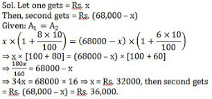 एक पिता अपनी विल में 68,000 रुपये की राशी को अपने दो बच्चो में बाटता है जिनकी आयु 10 वर्ष तथा 12 वर्ष है, जब उनमे से प्रत्येक 18 वर्ष के होंगे तो उन्हें सामान राशी प्राप्त होगी. यदि उस राशी को 10% की वार्षिक दर से रखा जाता है तो विल के समय उनमे से प्रत्येक को कितनी राशी प्राप्त होगी .