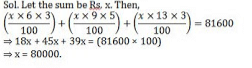 राम एक राशी को 6% की वार्षिक दर से पहले तीन वर्षो के लिए उधार लेता है तथा अगले पांच वर्षो के लिए 9% की वार्षिक दर से तथा उसके अगले आठ वर्षो के लिए 13% की वार्षिक दर से उधार लेता है. यदि ग्यारह वर्षो के बाद वह कुल 81600 रुपये ब्याज देता है, तो उसने राशी उधार ली ज्ञात कीजिये?