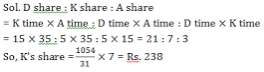 D, K और A एक कार्य क्रमशः 5, 15 और 35 दिन में कर सकते हैं. उन्हें एक साथ काम करके एक कार्य को पूरा करने के लिये Rs. 1054 की राशि मिलती है. उस राशि में K का कितना हिस्सा होगा ?