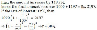 एक राशी को तीन वर्षो के निश्चित वार्षिक चक्रवृद्धि ब्याज की दर से निवेश किया जाता है. तीन वर्षो के बाद उस राशी में 119.7% की वृद्धि होती है तो ब्याज की दर ज्ञात कीजिये?
