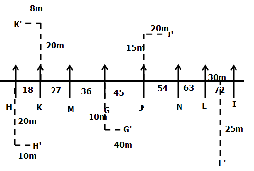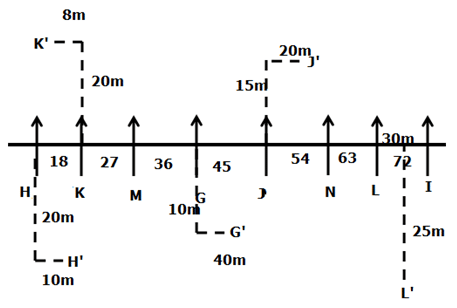 After the above arrangement, K walks 20m towards the north then took a left turn and walks 8m to reach K’. H walks 20m towards the south then took the left turn and walks 10m to reach H’. G walks 10m towards south then took left turn and walks 40m to reach G’. J walks 15m towards the north then took the right and walks 20m to reach J’. L walks 30m towards the east then took the right turn and walks 25m to reach L’.