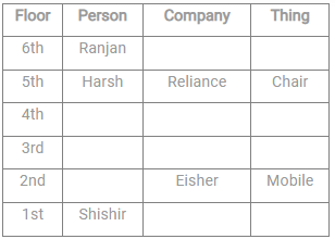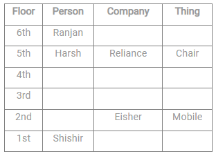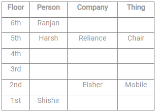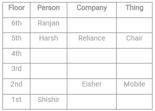 6) Ranjan lives four floors above the person who works in Eisher and Harsh works in Reliance.