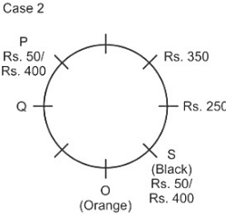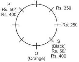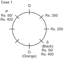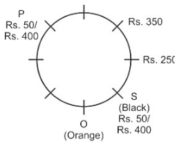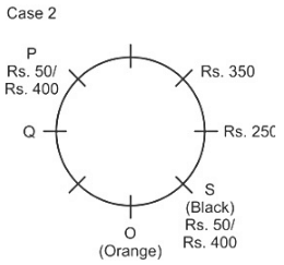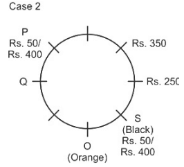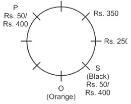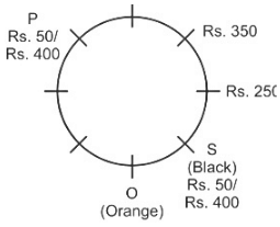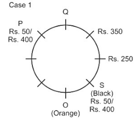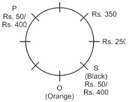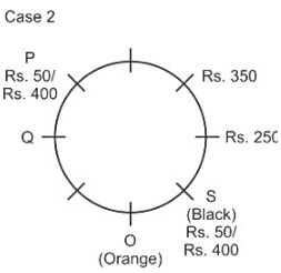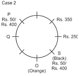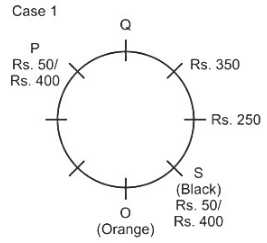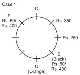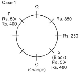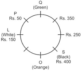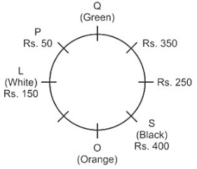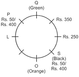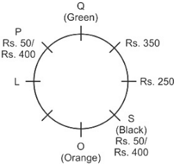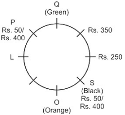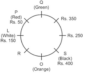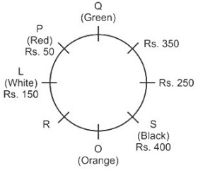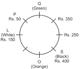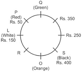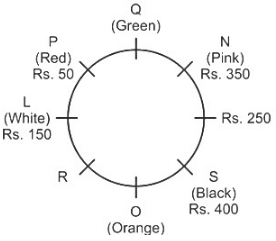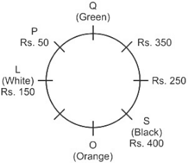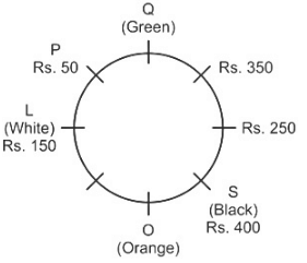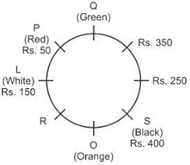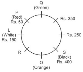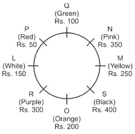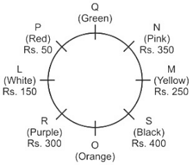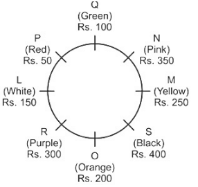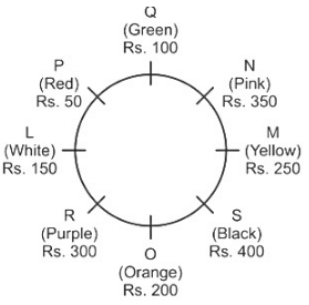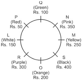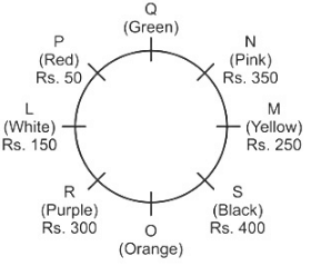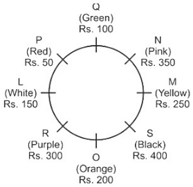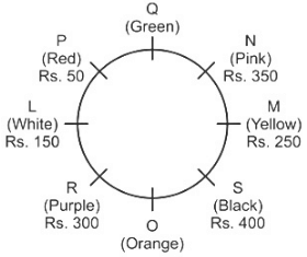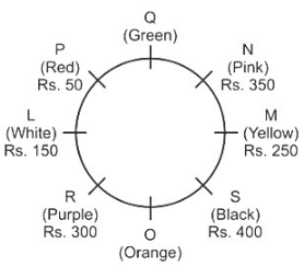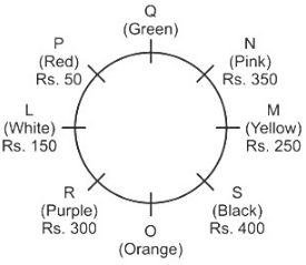 Eight friends - L, M, N, O, P, Q, R and S likes different colour - Pink, Yellow, Green, Red, White, Black, Orange and Purple but not necessarily in the same order. Each of them went for a picnic and spent in the multiples of Rs. 50 i.e. 50, 100, 150, 200, 250, 300, 350, 400 but not necessarily in the same order. Before coming back home, they all sat on a circular table facing the centre. The one who spent Rs. 350/- is three places to the right of O who likes Orange colour. The one who spends Rs. 250/- is three places to the left of P, who sits three places to the left of O. The difference of amounts spent by S who likes Black colour and P is maximum possible and they sat opposite to each other. There are only two persons sitting between Q and S. L sits sixth to the left of Q. Q likes green colour. L likes white colour spends Rs. 150/- and sits adjacent to the one who spends least. R sits 6th to the left of P who likes Red colour. There is only one person between N who likes Pink colour and the one who spends Rs. 50/-. R who likes Purple colour spends more amount at picnic than M. Difference in amounts spent by O and Q is Rs. 100/- and difference in amounts spent by O and S is Rs. 200/-.
