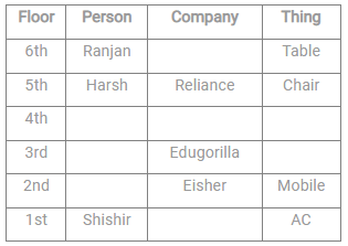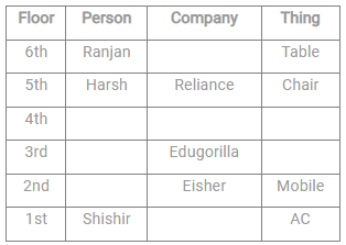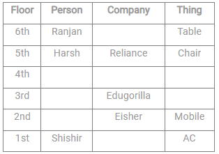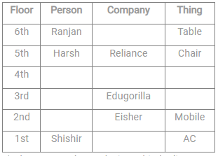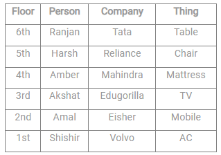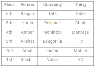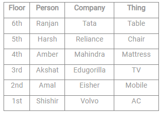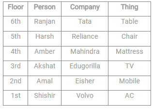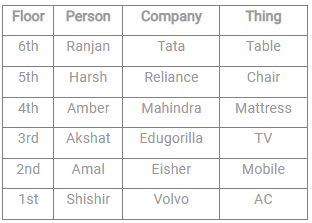 Six person, Amal, Akshat, Shishir, Amber, Harsh and Ranjan live on six different floor of a building, starting from floor 1 to floor 6. No two person works in the different companies namely Volvo, Reliance, Mahindra, Tata, Edugorilla, Eisher. They sold the different things which are Table, Mobile, TV, AC, Mattress, and Chair.
