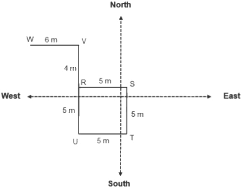 Rohan started from point R and started walking towards East for 5 m till he reached point S and then he turned right and walked for 5 m more to reach point T. From point T he turned right and walked for 5 m to reach point U and the again he turned right and went for 9 m to reach point V. From point V he turns left and walks for 6 m to finally reach point W.