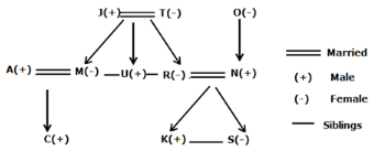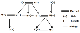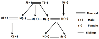 A family of three generations consists of eleven members and three married couples. N is the brother-in-law of U who is the only son of T. R is the sister of M who is the daughter of J. J is the father-in-law of N who does not have any siblings. M is not the spouse of N. K is the only son of R and brother of S. A is the father of C who is the nephew of U. O is the mother-in-law of R.