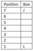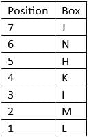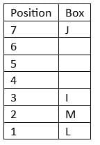 Seven boxes H, I, J, K, L, M, and N are kept in a stack one above the other but not necessarily in the same order. Box J is Six boxes above box L. Box M is positioned at a prime numbered position and is immediate below box I. Box I is positioned at an odd-numbered position. Box N is kept immediately above box H, who is not adjacent to box I. Which of the following box is kept in the middle of the stack?