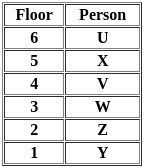 U, V, W, X, Y and Z live on different floors of the same building. The lowermost floor in the building is numbered 1, the floor above it is numbered 2, and so on till the topmost floor is numbered 6. Z lives on the floor immediately above Y. Only one person lives between U and V. W lives immediately above Z and immediately below V. Who lives on the second floor?