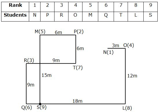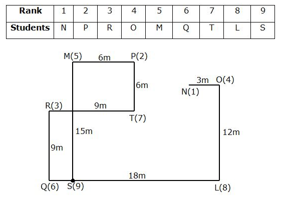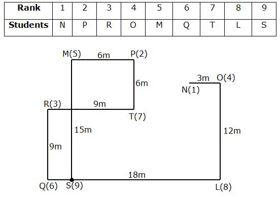 O is to the east of the one who secured the highest rank and north of the one who secured the second last rank. Q secured two ranks higher than the one who secured the second last rank and is to the west of him. The rank value of R is half of the rank value of Q and stands to the north of Q but to the southwest of O. The distance between Q and R is the same as the distance between R and T, who stands to the east of R. The direction of R with respect to Q is the same as the direction of P with respect to T. R holds the rank exactly between N and M, who stands to the west of P. At least four persons secured the ranks higher than M. The distance between M and S is the sum of the distance between PT and RQ. O doesn’t stand to the northeast of P. L secured immediately higher rank than S but immediately less than T.M is north of S.