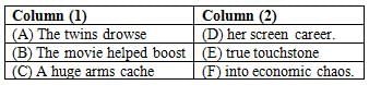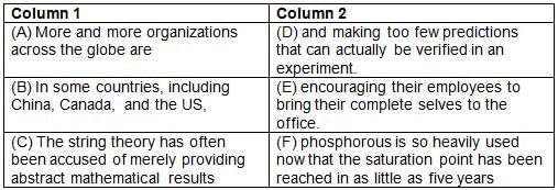 In the following question, two columns are given containing three phrases each. In the first column phrases are A, B, C and in the second column, the phrases are D, E, F. A phrase from the first column may or may not connect with a phrase from the second column to make a grammatically and contextually correct sentence. There are five options, four of which display the sequence(s) in which the phrases can be joined to form a grammatically and contextually correct sentence. If none of the options given forms a correct sentence after combination, select ‘None of these' as your answer.