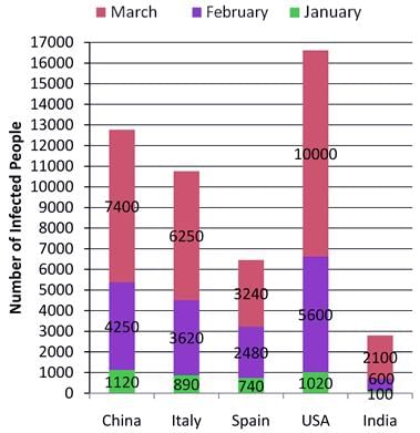 Data regarding the number of people who were tested positive with COVID-19 during January, February and March in five countries is given in the stack bar chart.