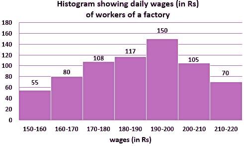 There is the histogram shows the daily wages ( in Rs.) of workers in a factory.
