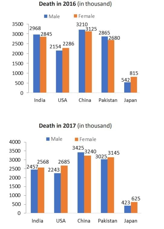 Direction : Study the following bar chart carefully and answer the given question.The bar graphs given below show the gender-wise deaths (in thousands) in five countries for the year 2016 and 2017.