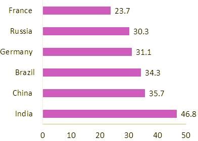 From the chart, it is clear that the maximum difference will be the difference between the quantity of milk produced by India and that of France = 46.8 – 23.7 = 23.1 billion litres
