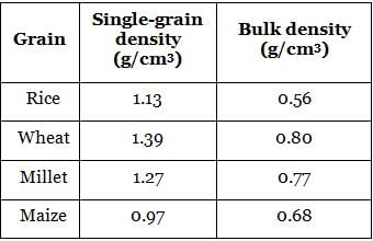 Single-grain density and bulk density of four varieties of grains are given in the table. If we take 1 kg of each of these, which one will have the largest volume?