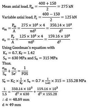 A bar of circular cross-section is subjected to alternating tensile forces varying from a minimum of 200 kN to a maximum of 500 kN. It is to be manufactured of a material with an ultimate tensile strength of 900 MPa and an endurance limit of 700 MPa. Using safety factors of 3.5 related to ultimate tensile strength and 4 related to endurance limit and a stress concentration factor of 1.65 for fatigue load. Using Goodman straight line as basis for design, the diameter of circular bar is