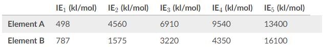 Based on the values for the first through fifth ionization energies in the table, what is the most likely identity of Element A and B?