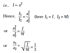 Two waves have the intensities I and 9I. What will be the ratio of their amplitudes?
