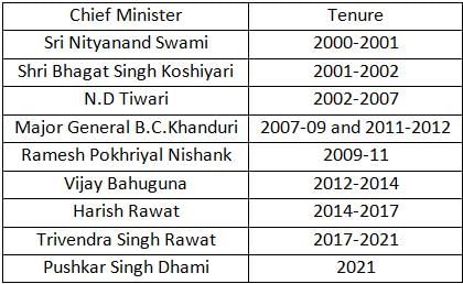 How many Chief Ministers have served Uttarakhand since its formation on 9 November 2000 till 2021?