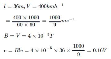The wing span of an aeroplane is 36 m. If the plane is flying at 400 km/h, the e.m.f. induced between the wings tips is (assume V = 4 X 10-5)