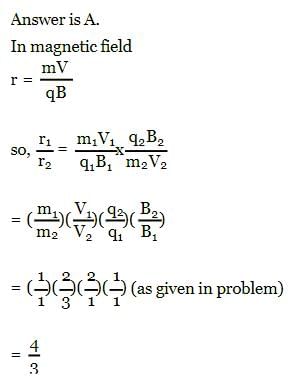 Two ions having masses in the ratio 1 : 1 and charges 1 : 2 are projected into uniform magnetic field perpendicular to the field with speeds in the ratio 2 : 3. The ratio of the radii of circular paths along which the two particles move is