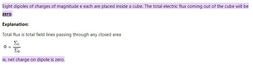 Eight dipoles of charges of magnitude e are placed inside a cube. The total electric flux coming out of the cube will be